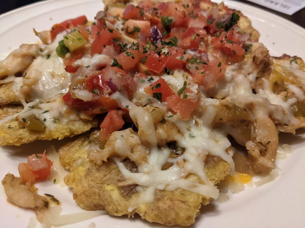 First App. – Tostones with chicken and cheese and salsa basically. Which were so good that we all said we needed to make at home. They sell them frozen in the Goya section in the supermarkets\stores in the USA. You can buy those and cook them and add your toppings of chicken, cheese, etc.