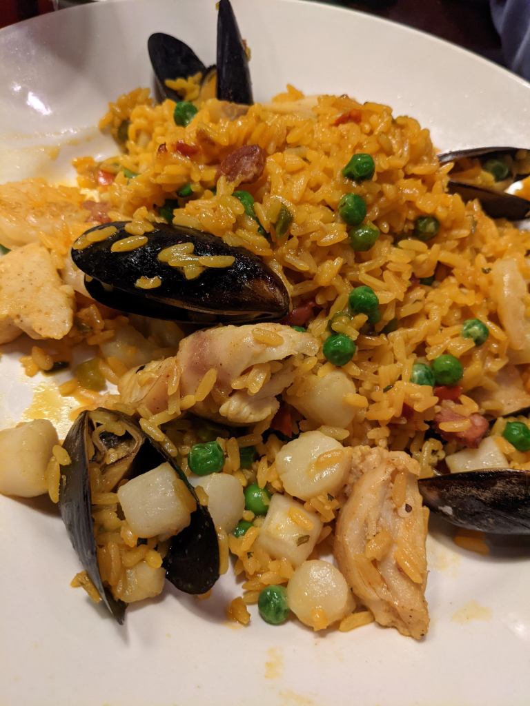 Seafood Paella – If you haven’t tried one before a paella is a blend of rice with seasonings, typically a little spice and then with different types of meats or seafoods, etc. I tasted this dish and it did not disappoint. I would try it if you like seafood.